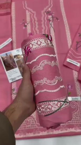 Refresh your summer wardrobe with this elegant Crimson embroidered lawn suit, crafted for comfort and timeless style. The lawn shirt features heavy embroidery on the front and fully embroidered sleeves, creating a refined designer look. A dyed lawn back keeps the outfit balanced, while the digitally printed voil dobby dupatta adds a soft, graceful finish. Lightweight and breathable, this suit is perfect for summer wear, casual gatherings, and day-to-day elegance.