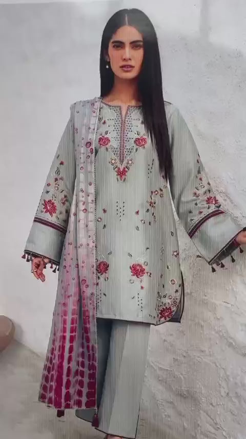 This luxury unstitched suit features full heavy embroidery on the front and sleeves, paired with a plain lawn trouser and a beautifully digital printed voil dupatta, perfect for festive and premium summer wear.
