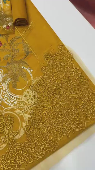 Maria B 6130 is made from premium quality Airjet Lawn 90/70 fabric. This luxury 3-piece suit features a heavy embroidered neckline patch with full multi-head chikenkari boring embroidery on the front, luxury embroidered bottom patch, and heavily embroidered sleeves with patch. The outfit is paired with a digital printed Bana-Dora voil lawn dupatta and a plain lawn trouser, making it perfect for elegant summer wear with designer look and premium comfort.